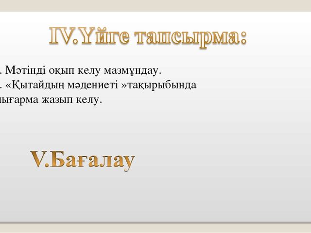 Үйге тапсырма 2 мин Бағалау 2 мин |