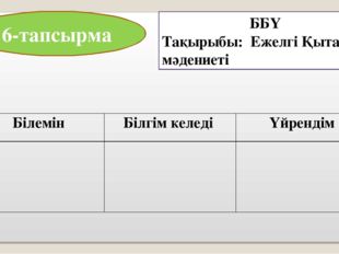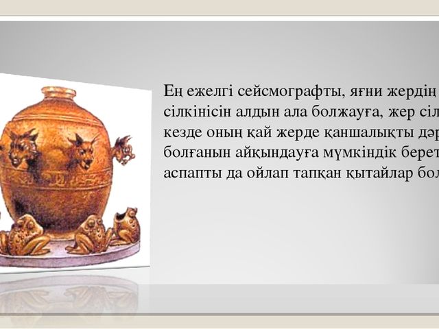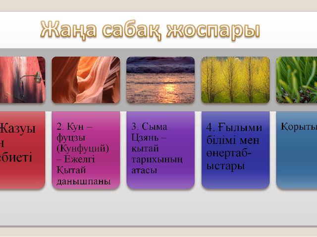 . 1.Ежелгі Қытайдағы ғылыми өнертабыстарды біледі 2. Құбылнама,сейсмограф,фарфор,жібектің қағаздың шығу тарихын біледі 3. Ғылыми өнертабыстардың ежелгі қоғамда және бүгінгі күнге дейін маңызы дәрежесін біледі |