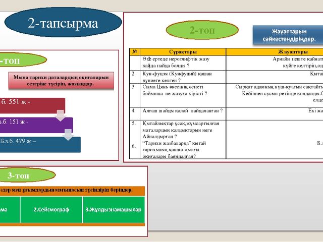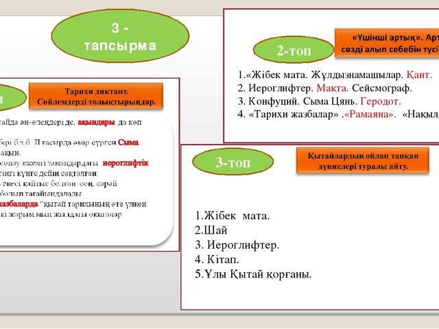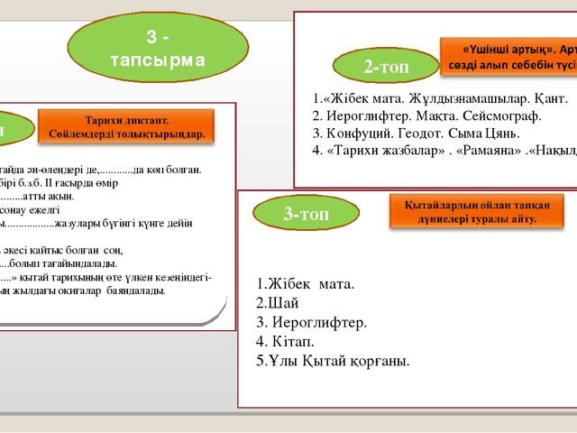 1. Математика саласындағы жетістіктерін .........көрсетеді .......талқылайды. 2.Астрономия саласындағы ашылған жаңалықтарды 3. Ежелгі Қытай дәрігерлерінің әдістерін ........... |