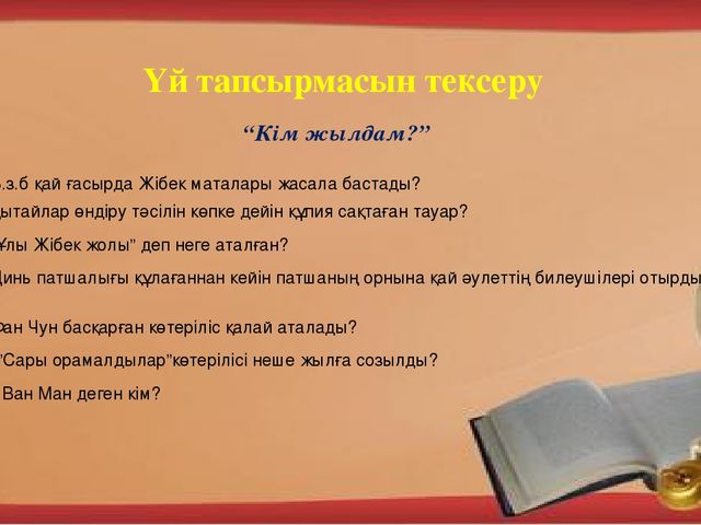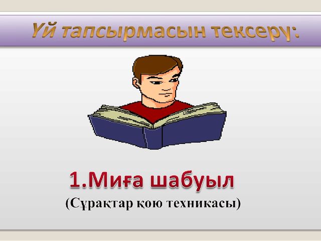 Ұйымдастыру кезеңі. Оқушыларды түгелдеу, сынып тазалығын тексеру, оқулықтарын тугелдеу Оқушылардың өткен тақырыбы бойынша алған білімдерін «ыстық орындық» әдісі арқылы пысықтау |