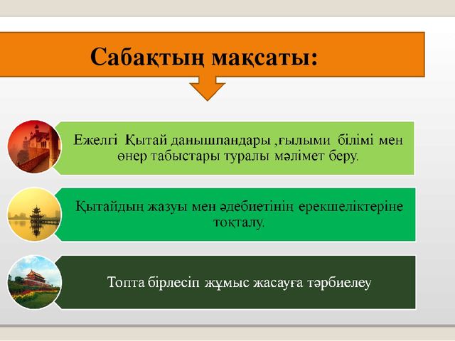 Жаңа сабақты интерактив тақта пайдалана өтырып тақырыпты ашу үшін Ежелгі Қытай туралы видеоролик көрсету. |