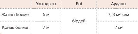 Жатын бөлменің ұзындығы-5м, қонақ бөлменікі-7м. Ал бөлмелердің ені бірдей. Жатын бөлменің ауданы қонақ бөлменің ауданына қарағанда 8м2 кем болса, онда әр бөлменің ауданы нешеге тең болады? Ш: 1) 7-5=2м 2) 8:2=4м(бөлмелердің ені) 3) 5*4=20 м2 (жатын бөлме ауданы) 4) 7*4=28 м2(қонақ бөлме ауданы) Ж: Жатын бөлменің ауданы-20 м2, қонақ бөлменің ауданы-28 м2. Есепті шығар.