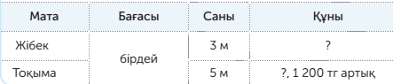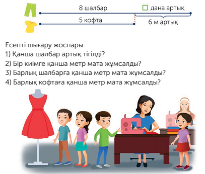 Шалбар-8дана, ?м, 6м артық Кофта-5дана, ?м Әрқайсысына-?м, бірдей Ш: 1) 8-5=3 (артық)-шалбар 2) 6:3=2м (1 киімге жұмсалады) 3)8*2=16м (барлық шалбарға) 4) 5*2=10м (барлық кофтаға) Ж: 8 шалбарға 16м, 5кофтаға 10м мата жұмсалады. |