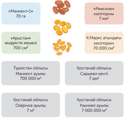 70га=700000м2 "Манкент-1"-Түркістан обл. Манкент ауылы 700см2=7дм2 "Арыстан" өнд. Кешені-Қостанай обл., Сарыкөл кент. 7км2=7000000м2 "Ряжское" кәсіпорны- Қостанай обл.,Ұзынкөл ауылы 70000см2=7м2 К.Маркс атындағы кәсіпорын-Қостанай обл.,Озёрное ауылы