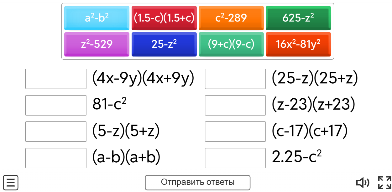 -екі өрнектің квадраттарының айырмасы формуласын білу -екі өрнектің квадраттарының айырмасы формуласын есеп шығаруда қолдану. |