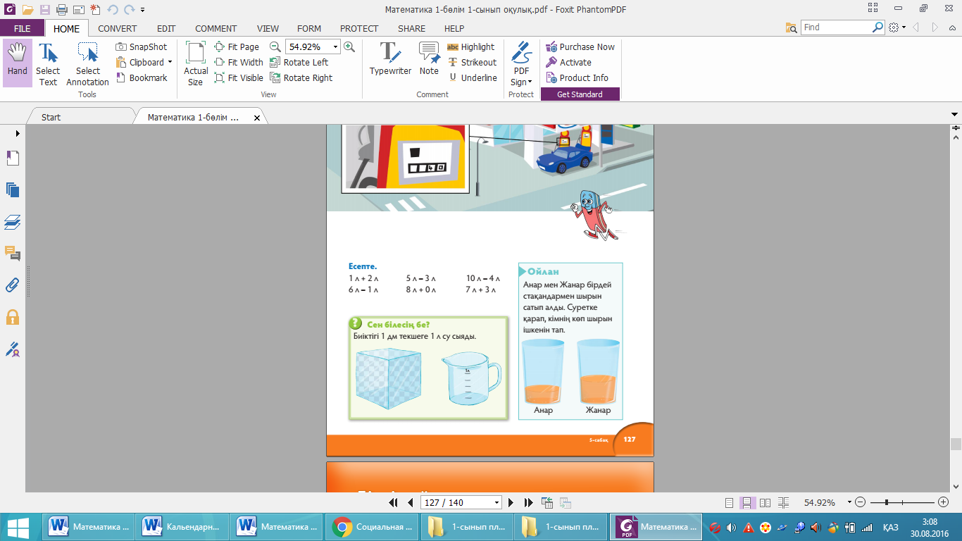 Қай ыдыста сусын көп? Ыдыстардағы сусынды салыстырып, қай ыдыстағы сусын ыдыстың көп көлемін алып тұрса, сол ыдыстағы сусынның мөлшері көп екенін анықтап, оның суретін қоршап сызады. Жауабы: а) бірінші; ә) екінші; б) бірде-біреуін қоршамайды, себебі олардағы сусын өзара тең. Қатар тұрған екі шелекте неше литр су бар екенін есепте. Тапсырманы орындамас бұрын, оқушылар “жұп” деген ұғымды естеріне түсіруі қажет. Бірнеше ыдыстағы судың көлемін табу үшін оларда көрсетілген сандарды қосу арқылы орындау керек. Жауабы: а) 20 л; ә) 10 л; б) 15 л. |
