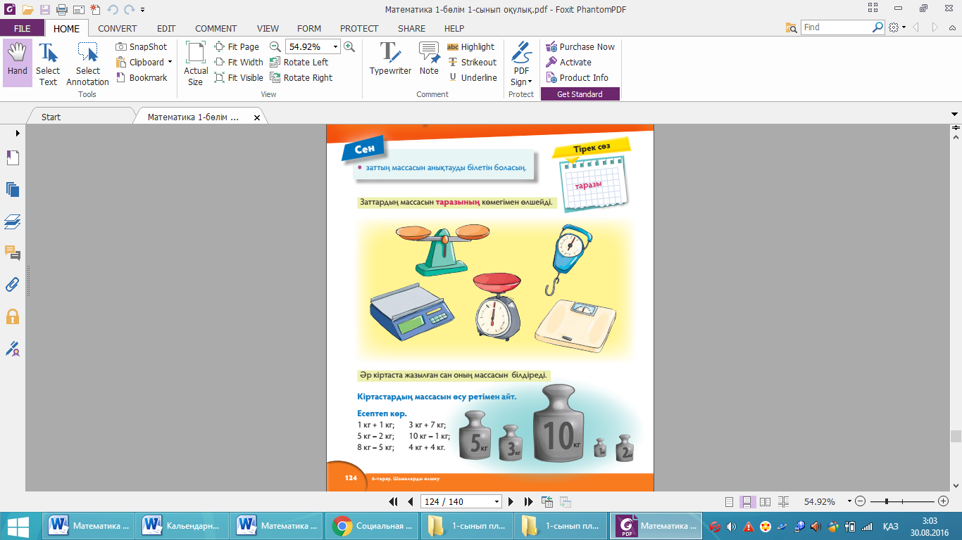Кіріспе тапсырма. Бір ыдысты алып, осы ыдыстың көлемін, массасын, ұзындығын өлшеуге болатынын айтыңыз. Мүмкін болса, бір ыдысқа әртүрлі өлшеу жұмыстарын жүргізіңіз. Сыйымдылығы 2-3 литр бо-латын әртүрлі бірнеше ыдысты қолданып, жұмысты топпен орындатыңыз (ыдыстар өлшеуге ыңғайлы болу керек): — бірінші, ыдыстың биіктігінің қанша сантиметр болатынын анықтатыңыз; — eкінші, ыдыстың сыйымдылығын бір литрлік құтының көмегімен су құйып анықтатыңыз; — үшінші, ыдысты таразыға салып, массасын анықтатыңыз. Жұмысты орындап болған соң әртүрлі сұрақтар қою арқылы қорытындылаңыз: Ұзындықты қандай өлшем бірлікпен анықтадың? (см) Ыдысқа 2 литр су сыяды. Қандай шама жайында айтылып тұр? (көлем) Массаның өзің білетін өлшем бірлігін ата. (кг) Ыдысқа қанша су сыятынын анықтау арқылы заттың несін білеміз? (көлемін) Ыдысты таразыға салып өлшеу арқылы нені анықтаймыз? (массасын) Табаныңның ұзындығын өлше. Тапсырманы орындау үшін оқулықтағы суретті басшылыққа ала отырып, оқушылардың барлықтарына табандары-ның ұзындықтарын өлшеуді ұсыныңыз. Олардың әрқайсысына табандарын бастырып сызуға бір парақ қағаздан таратып беріңіз. Одан кейін үлкен бақайынан өкшесіне дейінгі ұзындықты анықтатыңыз. Нұсқаулық ретінде оқулықтағы суретті ұсыныңыз. Табан ұзындығы бойынша аяқкиімнің өлшемін анықтауға болатынын түсіндіріңіз. Оқулықта берілген кесте бойынша оларға аяқкиімінің өлшемін анықтауды ұсыныңыз. |