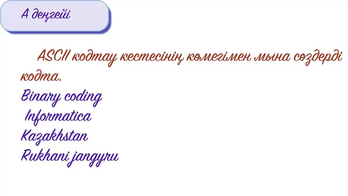 Дескриптор: -ascll кодтау көмегімен берілген сөздерді кодтайды; «Learningapps» бағдарламасы арқылы топтық жұмыс орындайды.