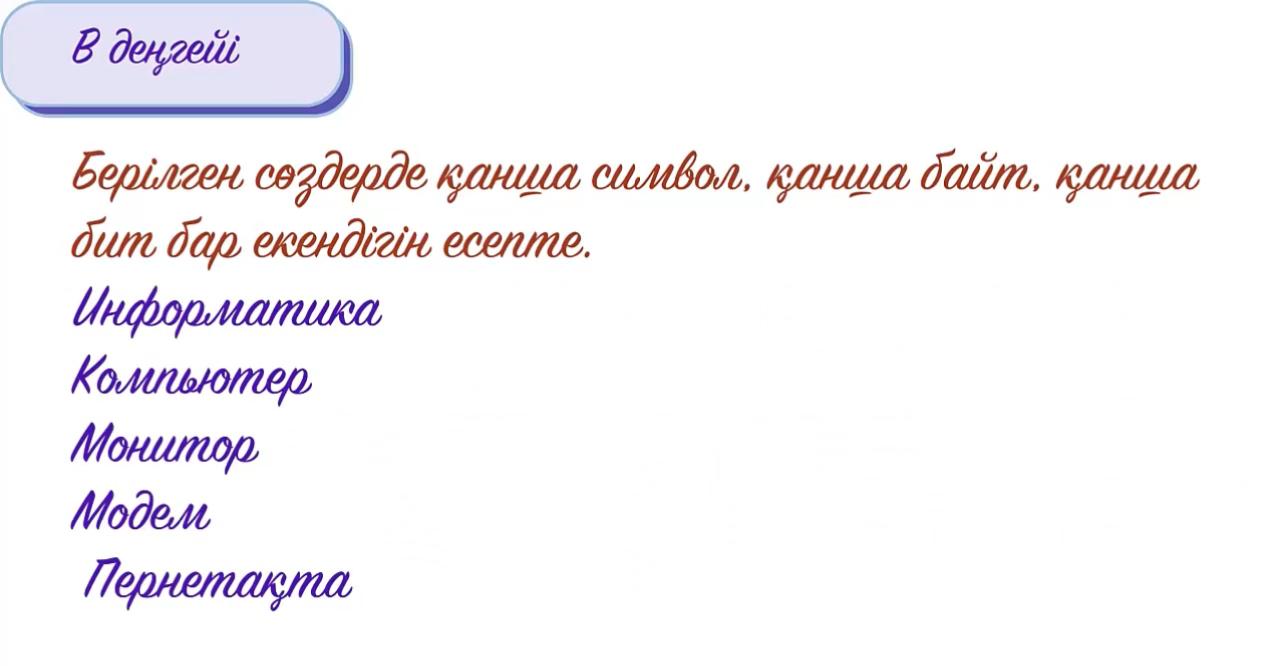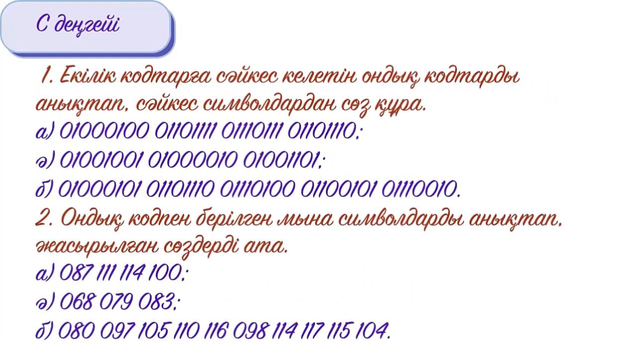 ақпаратты беру, қабылдау, ақпараттың түрлерін және қасиеттерін біледі; ақпаратты шифрлауды, екілік ақпаратты ұсына алады. ақпаратты екілік кодпен шифрлай алады |