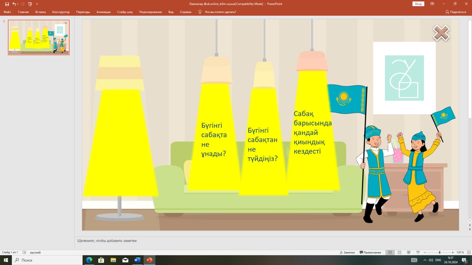Сабақтың соңында «Лампа» слайды арқылы кері байланыс жасайды. Отан, Қазақстан,Республика деген сөздер ASCII кодта жазып келу |