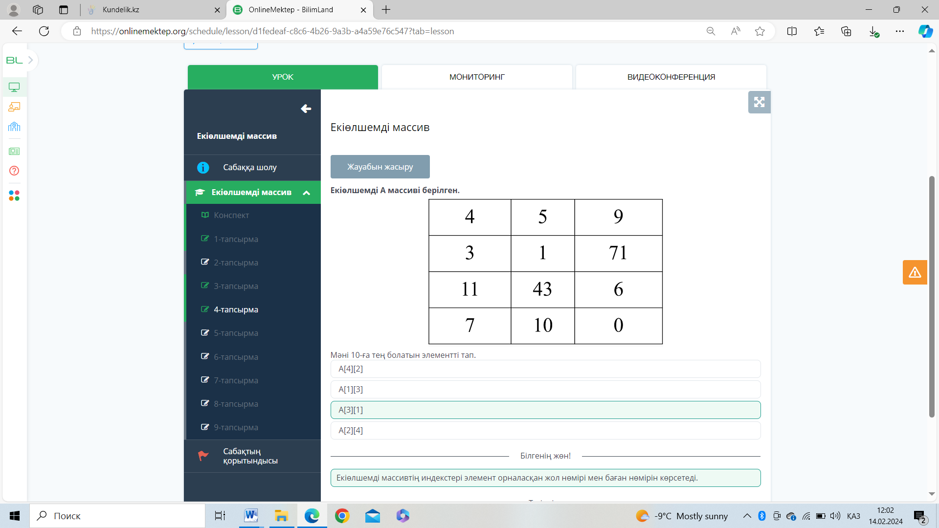 Берілген кесте бойынша жеке тапсырмалар орындайды. 1-оқушы. Екіөлшемді массив берілген. Мәні 43-ке тең болатын элементті тап. (A[2][1]) 2-оқушы. Екіөлшемді массив берілген. Мәні 10-ға тең болатын элементті тап. (A[3][1]) 3-оқушы. Екіөлшемді массив берілген. Мәні 0-ге тең болатын элементті тап. (А[3][0]) 4-оқушы. Екіөлшемді массив берілген. Мәні 4-ге тең болатын элементті тап. (А[0][0]) 5-оқушы. Екіөлшемді массив берілген. Мәні 71-ге тең болатын элементті тап. (A[1][2]) Дескриптор: