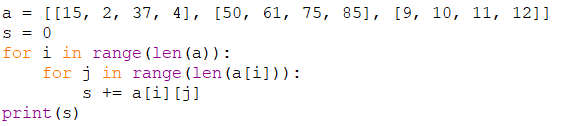 2-сурет Бұл массивте a[0][0]==15 және а[1][2]==75 болады. Python-да екіөлшемді массивтермен жұмыс істеу үшін кіріктірілген тізімдерді пайдалануға болады. Мысалы, кестедегі массивтің программасын a = [ [15, 2, 37, 4], [50, 61, 75, 85], [9, 10, 11, 12] ] түрінде жазуға болады. а тізімі әрқайсысы төрт саннан тұратын және белгілі бір массив мерзіміне сәйкес келетін үш кіріктірілген тізімнен тұрады. Екіөлшемді массивтің барлық жолымен жұмыс істегенде кіріктірілген тізімнің индексін көрсету керек. Екіөлшемді массивтің барлық элементін кіріктірілген циклдер арқылы көрсетуге болады. Сыртқы цикл жол индекстерінің, ішкі цикл баған индекстерінің мәнін көрсетеді. 1-мысал. Екіөлшемді массив элементтерінің қосындысын табу Бағдарламалық коды: