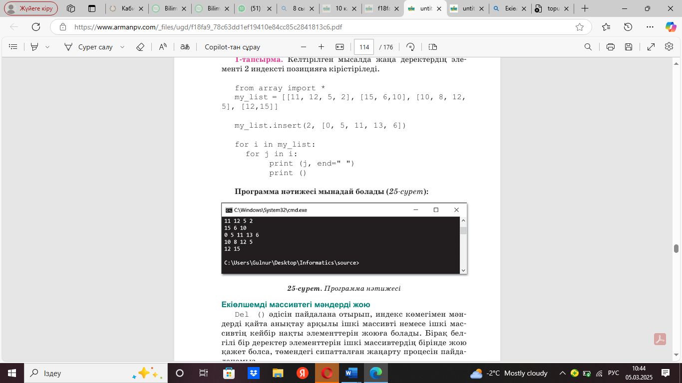 Элементтерді кірістіру үшін insert () және append() әдістерін, ал бірнеше элементті енгізу қажет болса expect () әдісін қолданамыз. x.insert(i,n) функциясы x көрсетілген массивінде n элементін i индексі бойынша кірістіруге мүмкіндік береді. Біз del операторын пайдаланып, массивтің элементтерін жоя аламыз. Сондай-ақ элементті жоюға remove() көрсетілген индексі бойынша элементті жою үшін pop() әдісін қолдануға болады. Жеке жұмыс. 1-тапсырма. А деңгейі