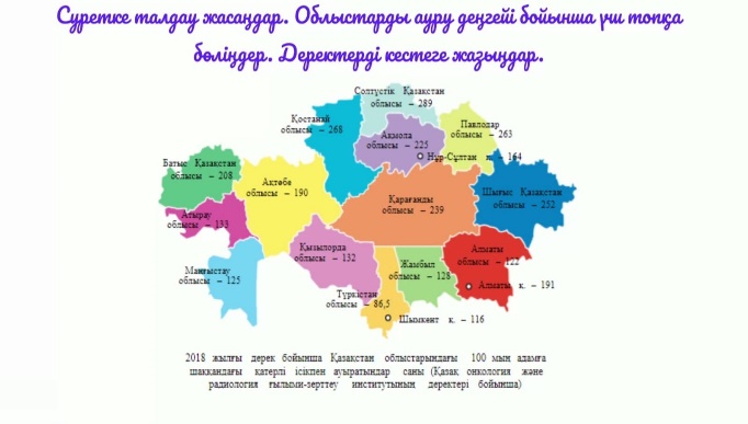2. Жаңа сабақты бекіту тапсырмалары (20–25 мин.) Топтық тапсырма: Картаға талдау жасаңыздар. Берілген облыстарды ауру деңгейі бойынша ранг әдісін пайдаланып үш топқа бөліңіздер: