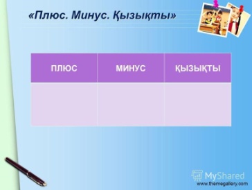 Рефлексия «Плюс, минус, қызықты» әдісі (П/М/Қ) «П» - сабақта ұнағаны: ақпарат, жұмыс түрлері. «М» - сабақтың ұнамаған немесе түсініксіз сәттері. «Қ» - қызықты мәліметтер, білгісі келетін мәселелер бойынша сұрақтар.