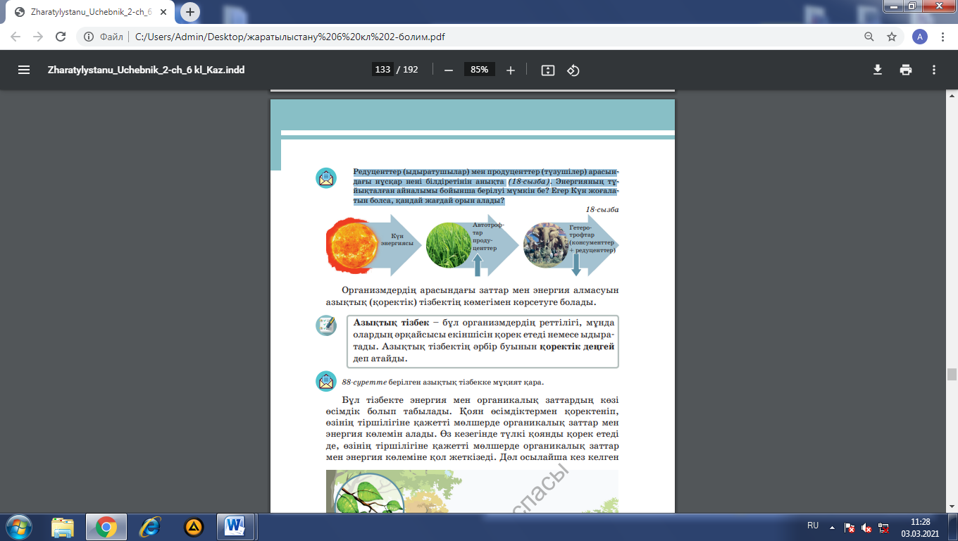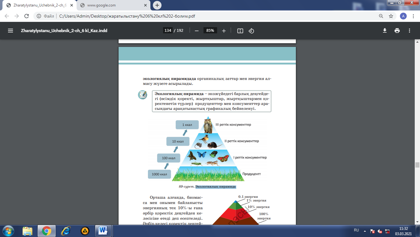 1.Азықтық тізбек дегеніміз не? 2. Экологиялық пирамида ұғымына анықтама береіңдер. |
