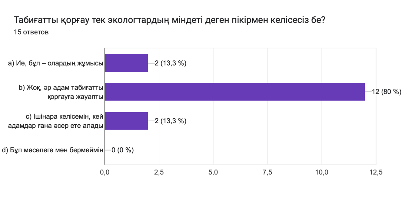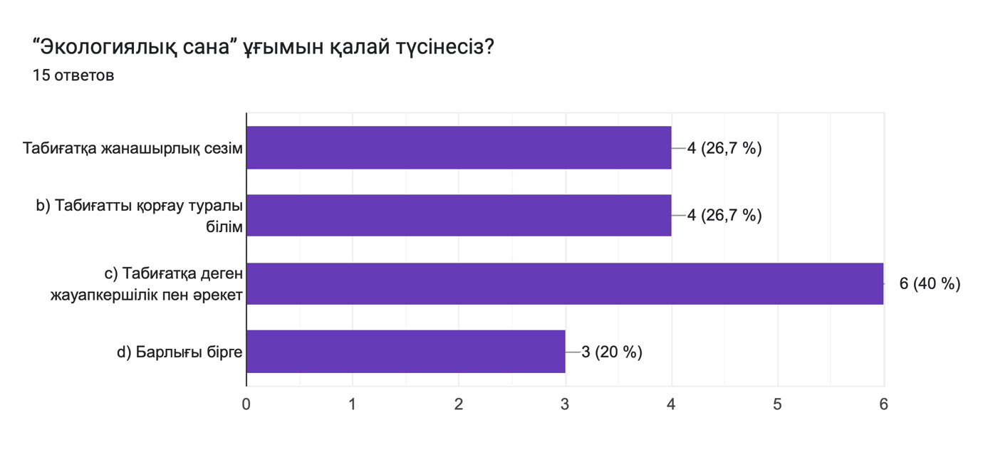 Сондықтан, экологиялық тәрбиені жүйелі түрде жүргізу , оның ішінде пәнаралық интеграцияны күшейту және оқушыларды тәжірибелік жобаларға белсенді тарту арқылы , экологиялық функционалдық сауаттылықты(білімді өмірде қолдану қабілетін) арттыру қажет. Жас азаматтардың өз қаласына, еліне деген құрметінің көрінісі болып табылатын эко-белсенділікке "уақыт болса қосыламын" (53%) деген көзқарасты өзгертіп, оларды өзгерістің бір бөлігі болуға шақыру қажет. Бұл – ұлы даланы, оның байлығын және таза ауасын болашақ ұрпаққа аманаттаудың ең сенімді жолы.