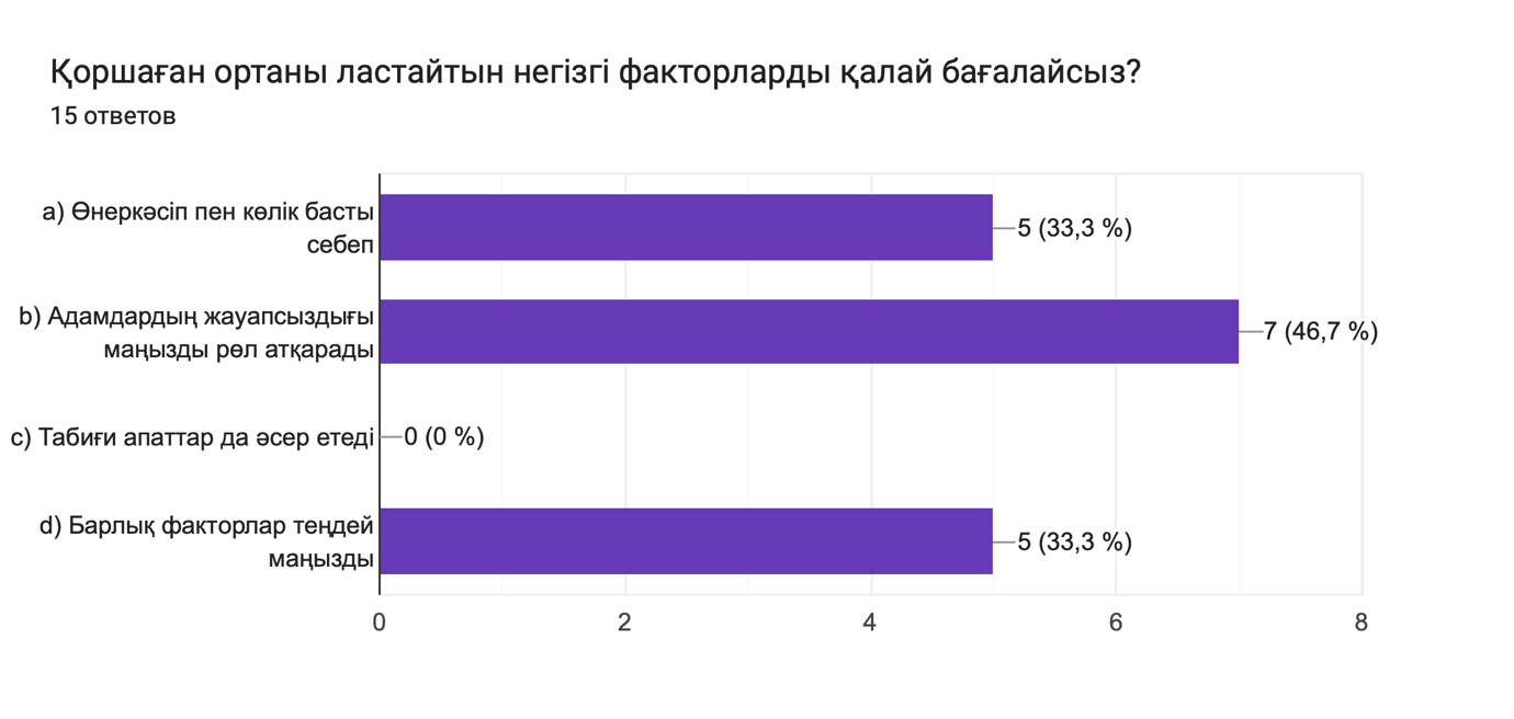 Эко-Белсенділік: Оқушылардың пассивті бақылаушы болуына жол бермеу. "Мектеп экобағы", "Пластикке екінші өмір" жобалары арқылы оларға өзгерістің бір бөлігі болу мүмкіндігін беру. Сауалнамада оқушылардың 53%-ы белсенділікке «уақыт болса қосыламын» дегені, біздің оларға бұл іске деген қызығушылығын арттыру керек екенін көрсетеді. Эко-белсенділік – бұл жай ғана тазалау жұмысы емес, бұл – оқушының өз қаласына, өз еліне деген құрметінің көрінісі.