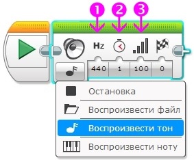 Как вы видите - отображению информации на экране главного модуля EV3 среда программирования придает огромное значение. Давайте рассмотрим следующий важный программный блок "Звук". С помощью этого блока мы можем выводить на встроенный динамик блока EV3 звуковые файлы, тона произвольной длительности и частоты, а также музыкальные ноты. Давайте рассмотрим настройки программного блока в режиме "Воспроизвести тон" (Рис. 8). В этом режиме необходимо задать"Частоту" тона (Рис. 8 поз. 1), "Продолжительность" звучания в секундах (Рис. 8 поз. 2), а также громкость звучания (Рис. 8 поз. 3).