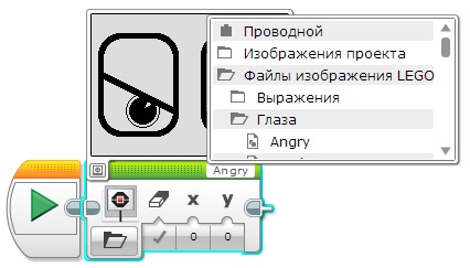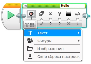 Программный блок "Экран" имеет четыре режима работы: режим "Текст" позволяет выводить текстовую строку на экран, режим "Фигуры" позволяет отображать на экране одну из четырех геометрических фигур (прямая, круг, прямоугольник, точка), режим "Изображение" может вывести на экран одно изображение. Изображение можно выбрать из богатой коллекции изображений или нарисовать свое, используя редактор изображений. Режим "Окно сброса настроек" сбрасывает экран модуля EV3 к стандартному информационному экрану, показываемому во время работы программы.