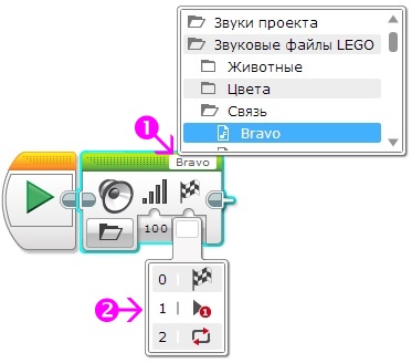 В режиме "Воспроизвести файл" вы можете выбрать один из звуковых файлов из библиотеки (Рис. 10 поз. 1), либо, подключив к компьютеру микрофон, с помощью Редактора звука ("Главное меню среды программирования" - "Инструменты" - "Редактор звука") записать собственный звуковой файл и включить его в проект.