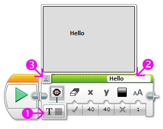 Рассмотрим параметры программного блока "Экран" в режиме "Текст" (Рис. 2 поз.1). Строка, предназначенная для вывода на экран, вводится в специальное поле (Рис. 2 поз. 2). К сожалению, в поле ввода текста можно вводить только буквы латинского алфавита, цифры и знаки препинания. Если режим"Очистить экран" установлен в значение "Истина", то экран перед выводом информации будет очищен. Поэтому, если вам требуется объединить текущий вывод с информацией уже находящейся на экране, то установите этот режим в значение "Ложь". Режимы "X" и "Y" определяют точку на экране, с которой начинается вывод информации. Экран блока EV3 имеет 178 пикселей (точек) в ширину и 128 пикселей в высоту. Режим "X" может принимать значения от 0 до 177, режим "Y" может принимать значения от 0 до 127. Верхняя левая точка имеет координаты (0, 0), правая нижняя (177, 127)