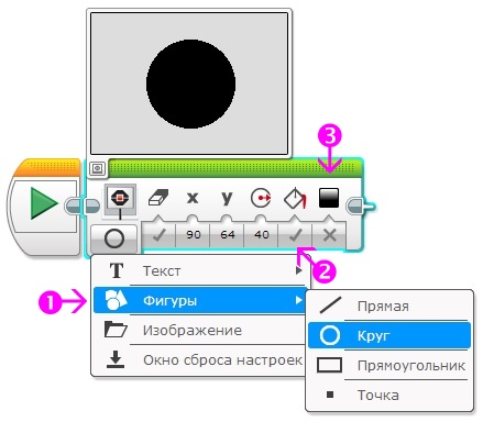 В режиме "Фигуры" (Рис. 4 поз. 1) настройки программного блока меняются в зависимости от типа фигуры. Так при отображении круга необходимо будет задать координаты "X" и "Y" центра окружности, а также значение "Радиуса". Параметр "Заполнить" (Рис. 4 поз. 2) отвечает за то, что будет отображен либо контур фигуры, либо внутренняя область фигуры будет заполнена цветом, заданным в параметре"Цвет" (Рис. 4 поз. 3).
