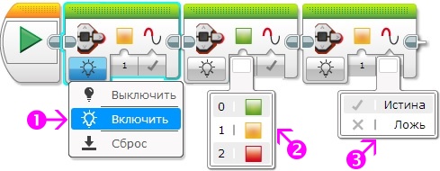 Нам осталось познакомиться с последним программным блоком зеленой палитры - блоком "Индикатор состояния модуля". Вокруг кнопок управления модулем EV3 смонтирована цветовая индикация, которая может светиться одним из трех цветов: зеленым, оранжевым или красным. За включение - выключение цветовой индикации отвечает соответствующий режим (Рис. 11 поз. 1). Параметр "Цвет" задает цветовое оформление индикации (Рис. 11 поз. 2). Параметр "Импульсный" отвечает за включение - отключение режима мерцания цветовой индикации (Рис. 11 поз. 3). Как можно использовать цветовую индикацию? Например, можно во время различных режимов работы робота использовать различные цветовые сигналы. Это поможет понять: так ли выполняется программа, как мы запланировали.