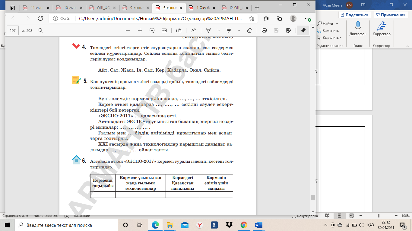 Көп нүктенің орнына тиісті сөздерді қойып жазады; Сөйлемдерді толықтырады; Тыныс белгілерінің қойылу себебін түсіндіреді. Ақпарат көздерін пайдаланып, «ЭКСПО-2017» көрмесі туралы сұхбаттасыңдар. Ресми сөздер мен дайын тіркестерді, терминдерді қолданыңдар. |
