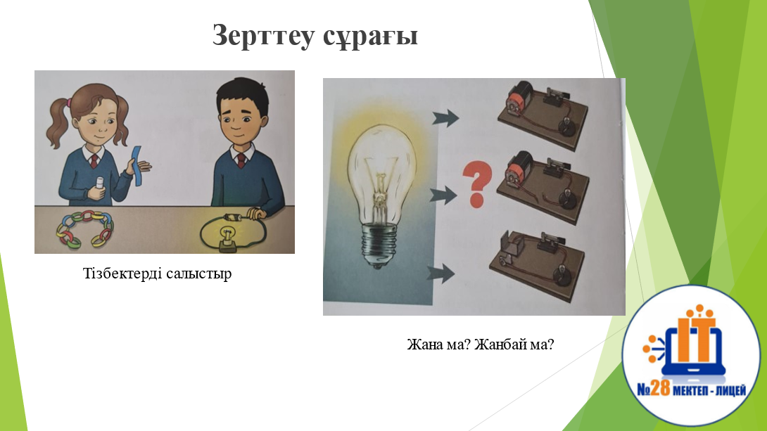 Бағалау критерий: Электр тізбегі неден тұратынын біледі; Электр тізбегінің жұмысымен танысады. Нұсқаулық: Электр тізбегінің элементтерін анықта