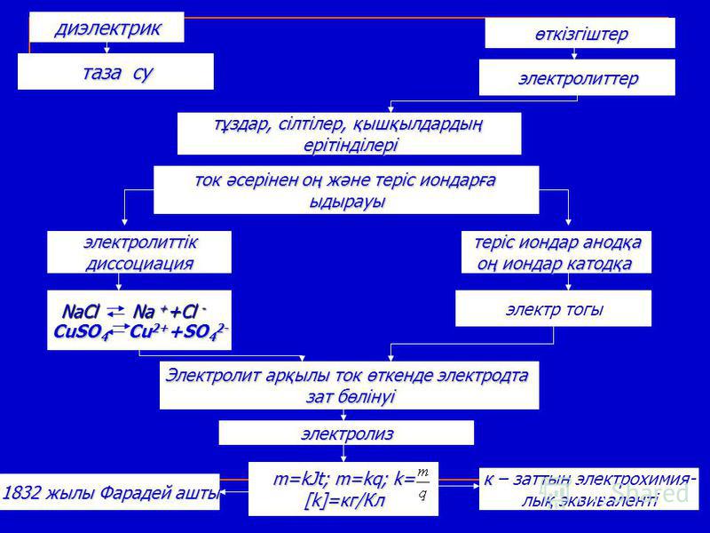 Сұйықтардағы электр тогының табиғатын ауызша және жазбаша түрде сипаттай алады. Жаңа терминдер:электролиз,рекомбинация |