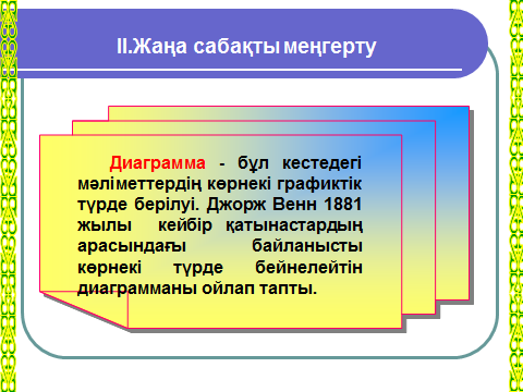 Сабақтың тақырыбы «Кестелік деректерді графикалық түрде ұсыну. Диаграммалар» 6. Сабақтың мақсатымен таныстыру