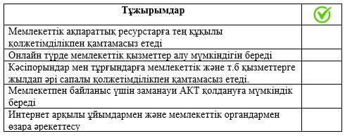 Мұғалім тапсырма парағын таратады немесе интербелсенді тақтада көрсетеді. Оқушылар тапсырманы жеке орындайды. Тапсырма: Электронды үкімет функцияларын көрсетіңіз.