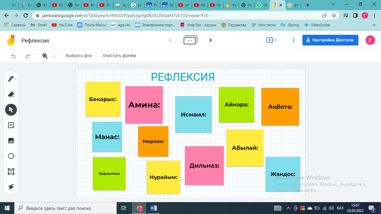 Рефлексия: Jamboard тақтасы арқылы рефлексия жүргізу. Үй тапсырмасы. Ата-анаңызға ЭЦҚ алып беру. |
