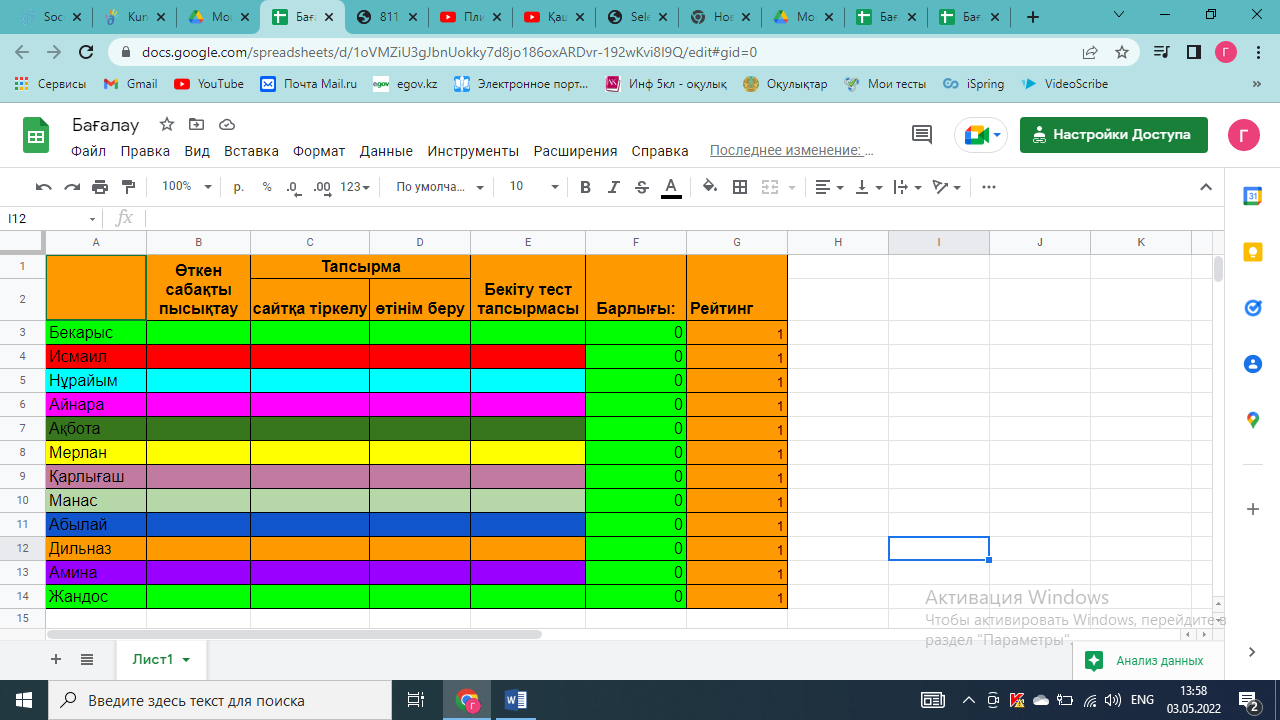 Оқушылардың барлық тапсырмаларының нәтижелерін интерактивті тақтадан гугл таблица арқылы көрсетемін. |