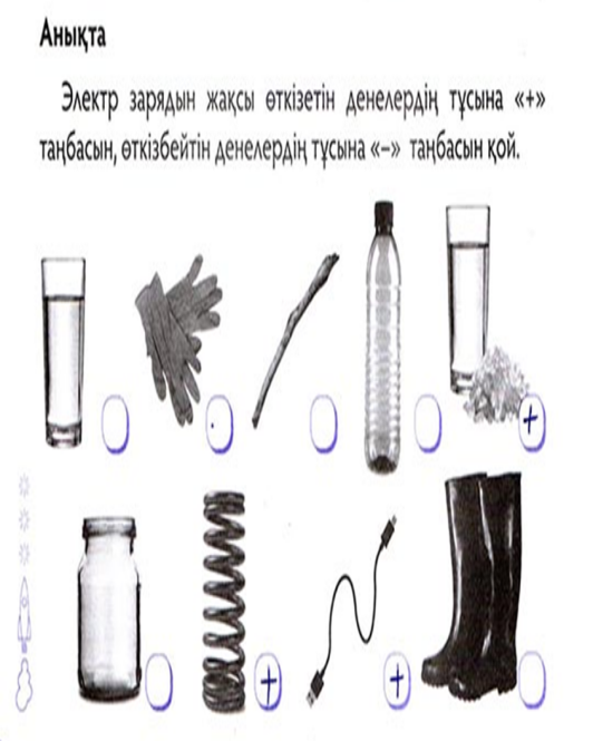 Тамаша жұмыс! Дескриптор: Электр зарядын жақсы өткізетін заттарды белгілейді-1Б Заттардың қасиеттерін біледі-1Б ҚБ: