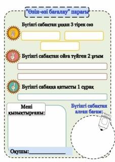 Кері байланыс жүргізіледі Оқушыларға кері байланыс парағы беріледі. Бүгінгі сабақта не түсініп, не түсінбегенін жазып, кері байланыс береді.