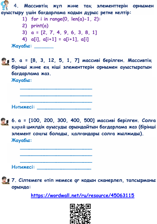 Топтарға бөлінеді, тапсырманы орындайды Жұмыс парағы бойынша тапсырмалар орындайды: - бағдарлама нәтижесін жазады - бағдарлама кодын және нәтижесін жазады - бағдарламаның нәтижесін жазады Көз жаттығуларын орындау - бағдарлама кодын дұрыс ретімен жазады - бағдарлама кодын және нәтижесін жазады - бағдарлама кодын және нәтижесін жазады - интерактивті тапсырманы орындайды |