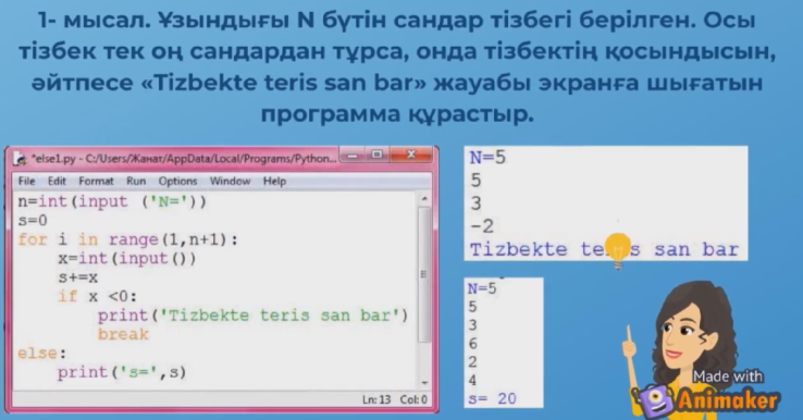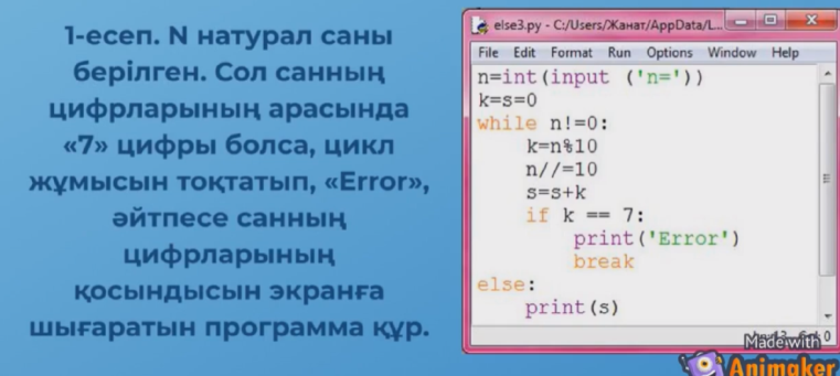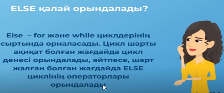 Python тілінде еlse циклін программалай біледі, практикада қолданады. |