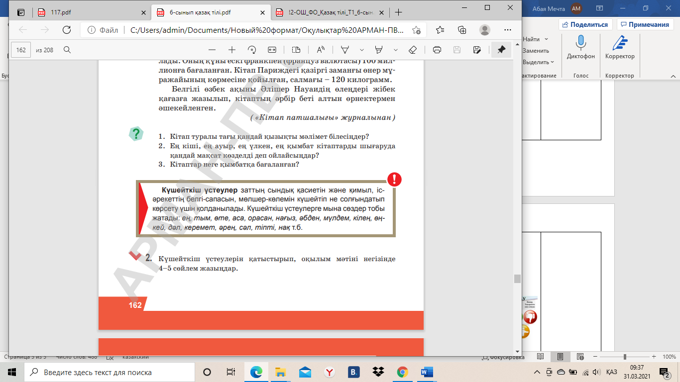 Тапсырма. 2-тапсырма. Күшейткіш үстеулерін қатыстырып, оқылым мәтіні негізінде 4–5 сөйлем жазыңдар.