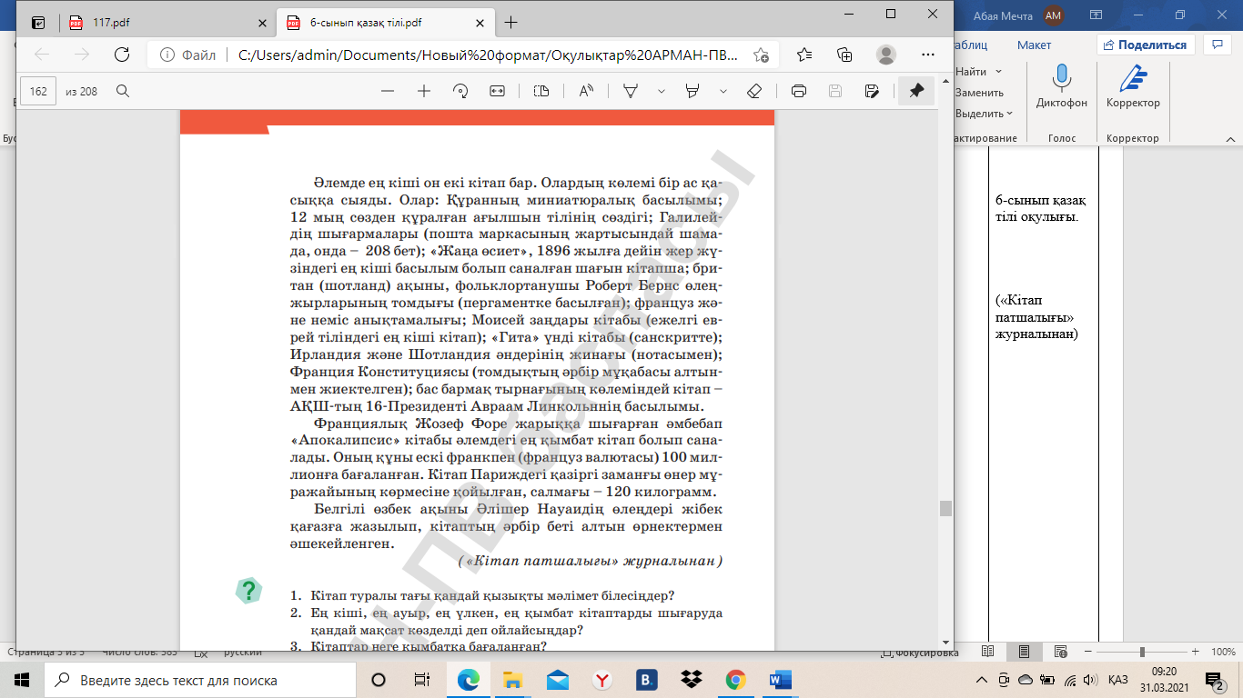 -Бұл ең сабырлы ұстаз -Қайырымдылық пен айуандықты танытады -Ақиқат пен жалғанның аражігін ажыратуға үйретеді -Оған адалдық танынтқан жөн -Ол саған ақылшы бола алады -Оны қолдан жасайды -Ол әртүрлі болады -Оны білімділер қадірлейді... Жұптық жұмыс «Ойлан, жұптас, бірік» әдісі арқылы «кітап» сөзіне ереже шығартамын. Сондай-ақ, оны елбасының ойымен нақтылау. «Кітап - ең сабырлы ұстаз. Тек кітап қана қайырымдылық пен айуандықтың, ақиқат пен жалғанның аражігін айнытпай танытып білуге үйретеді. Кітапты аялайық, құрметтейік, кітапқа адал болайық!» (Н.Ә.Назарбаев) Тапсырма. Мәтінді түсініп оқыңдар. «Түртіп ал, сұрақ құрастыр» әдісі арқылы мәтінде көтерілген мәселені анықтауға бағытталған үш сұрақ әрі үш жауап дайындайды. Ой түрткі Кітап туралы қандай қызықты мәлімет білесіңдер? Көлемі жағынан ерекше кітаптар шығаруда қандай мақсат көзделді деп ойлайсыңдар? Кітаптар неге қымбат