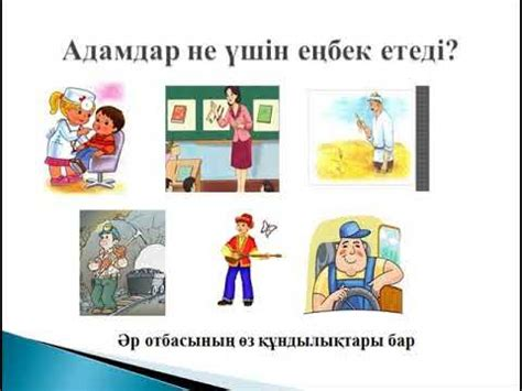 Мұғалім: 2-тапсырма. Ведио ролик көру. Оқушылар бүгінгі біздің тәрбие сағатымыз еңбек тақырыбында болмақ. Осы видеодан көргеніміздей, адам өмірінде өзіне ыңғайлы, өзі қызығатын, қолынан келетін істі істесе, еңбегінің өзіне де, өзгеге де пайдасы мол, жемісті болып, еліне, халқына пайдасы берекелі болады. «Еңбек» сөзіне тоқталайық. Еңбек адамды тәрбиелейді, қуаныш сыйлайды, жігерлендіреді, шынықтырады, пайдалы өмір сүруге үйретеді. Адамның адам болуында еңбек шешуші роль атқарған. Адамзат еңбекті, еңбектің құралдарын жетілдіре отырып, өзі де жетіліп кемелдене берген. Сондықтан қоғамның даму тарихын еңбек пен еңбек құралдарының өзгеру, жетілу тарихы деуге де болады. Тіршілік жағдайының қиындауы еңбекті күрделендірді.