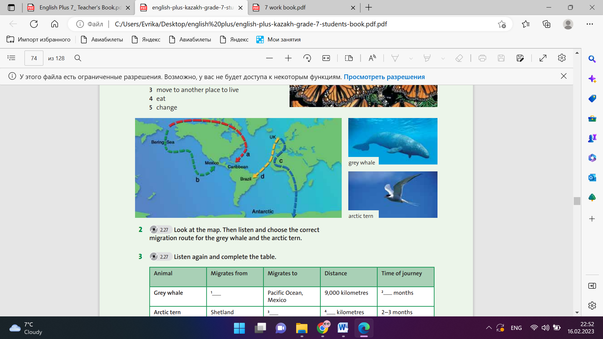 Ex: 1 P: 74 • Refer students to the pictures and elicit or teach the names of the animals (arctic fox, snake, salmon, butterfly). • Play the CD, and ask students to listen and read the text. • Students match the words in blue with the definitions. • Check answers, and make sure that students understand the meaning of the blue words, for example, by asking them to translate them into their own language. Differentiation: «Verbal support» method is used to help Students use new words in the text. Ex: 2 P:74 • Focus on the map and the pictures. Model pronunciation of grey whale and arctic tern. • Play the CD and ask students to read and listen, and choose the correct migration routes.