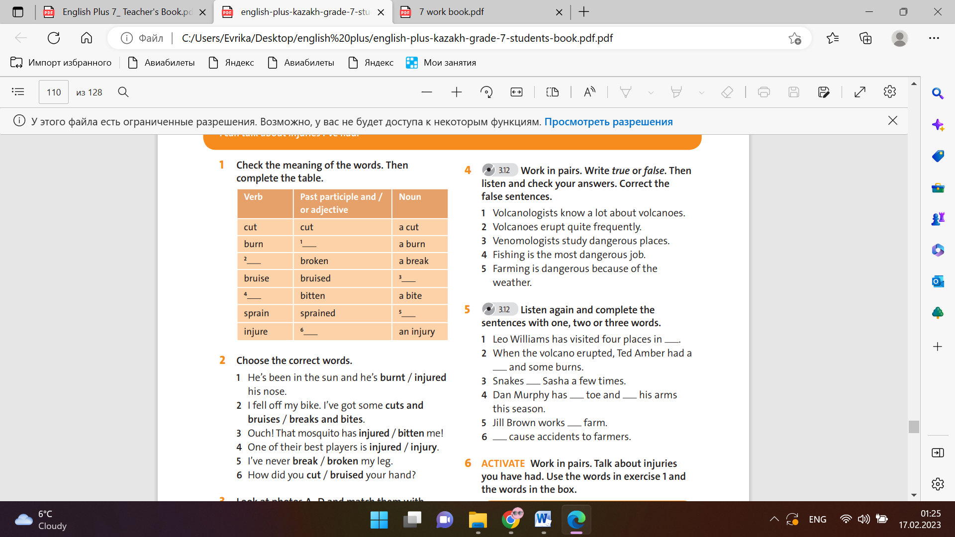 Students check the meaning of the words. Then complete the table. ANSWERS: 1 burnt 2 break 3 a bruise 4 bite 5 a sprain 6 injured Students choose the correct words. ANSWERS: 1 burnt 2 cuts and bruises 3 bitten 4 injured 5 broken 6 cut Students look at the photos and match them with jobs in the programme guide. ANSWERS: A 2 B 1 C 4 D 3 Students work in pairs. Write true or false. Then listen and check your answers. ANSWERS: 1 True. 2 False. Volcanoes don’t erupt very often. 3 False. Venomologists study venom. 4 True. 5 False. Farming is dangerous because of the big machines. |