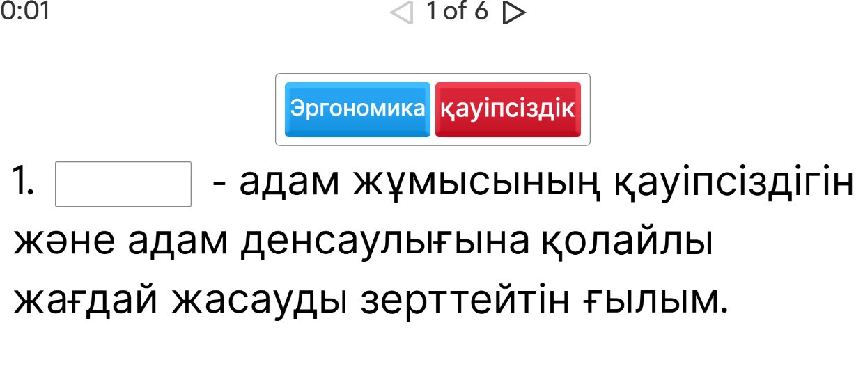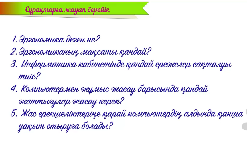 Жаңа білім «Эргономика» сөзі грек тілінен аударғанда «жұмыс заңы» деген ұғымды білдіреді. Эргономика адамдардың «адам-технология-қоршаған орта» жүйесіндегі жұмысының қауіпсіздігі мен жайлылығын қамтамасыз етілуін жан-жақты зерттейтін ғылым саласы. Эргономиканың негізгі мақсаттары: