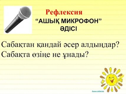 «Ашық микрофон» әдісі арқылы бүгінгі сабақ туралы өз ойларын айтады |