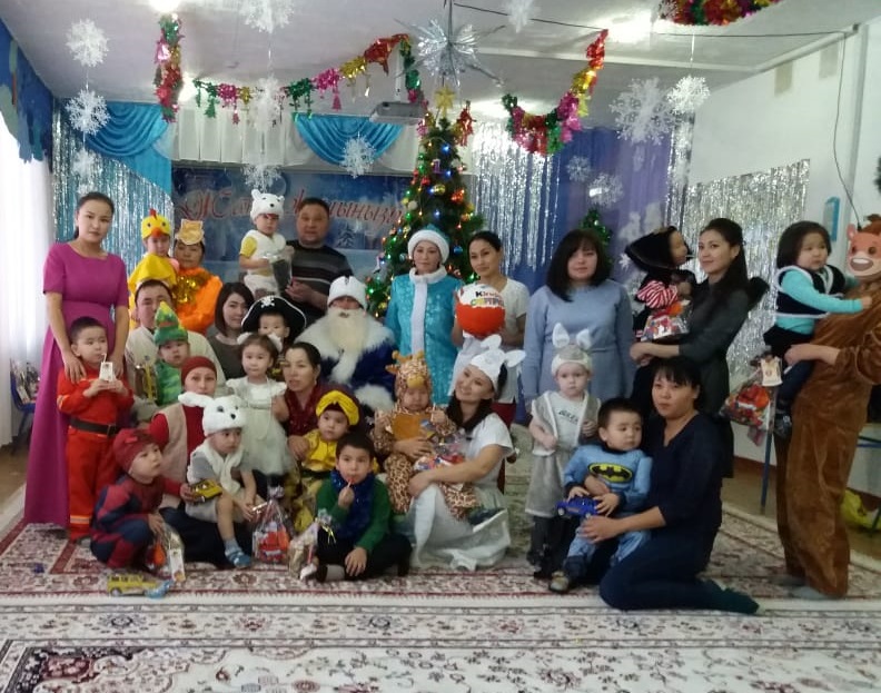 -Сәлеметсіздер ме балалар, қонақтар, Жаңа жыл құтты болсын! Мен тәттілердің тәттісі, аяз атаның көмекшісі Киндер сюрпризбын! Аяз ата мен сіздің бұйрығыңызды екі етпей орындадым, «Гүлдер » тобына барлық сыйлықтарды алып келдім.