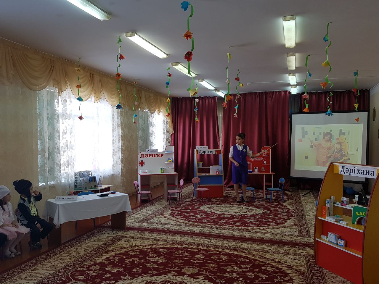 Сырт киімді қабылдау орнына- Назерке, тіркеу орнына- Адия, бала дәрігері- Шахризада, құлақ дәрігері- Дәулет,медбике- Назым, тіс дәрігері- Санжар, медбике-Ажар, дәріханашы- Адиля. Енді ойынымызды бастайық.