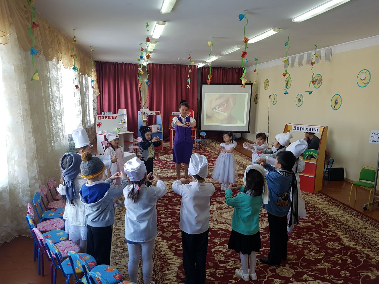-Біз сол бір мамандық иесі дәрігермен танысамыз. Дәрігер – ол адамдардың дені сау болу үшін көп еңбек етеді. Ауырмауымыз үшін не істеу керек,балалар?