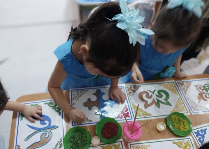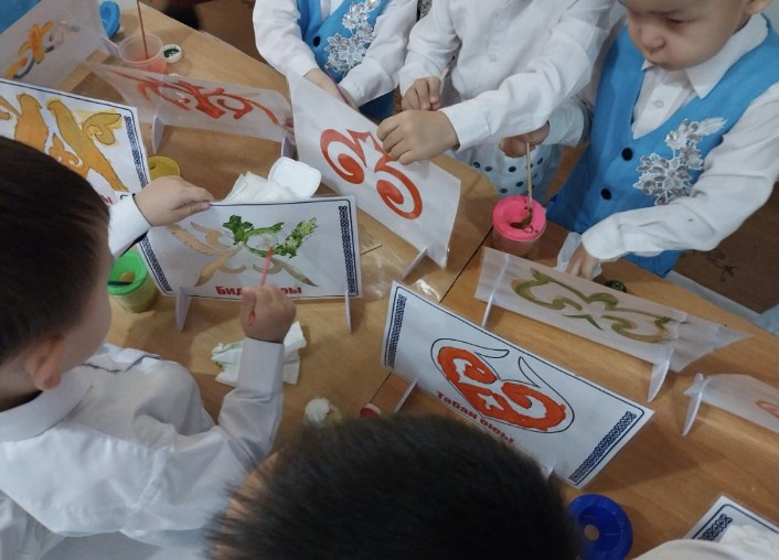 Балалар енді біз трефаратпен қазақтың ұлттық ою өрнектерімізді бояп шығайық және қыздарымыз қуыршақтың оюларын бояп берсе және ою-өрнектерді сәйкестендіріп шығамыз